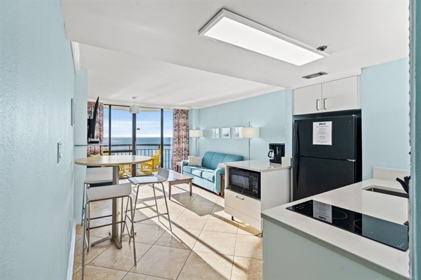 Enjoy the convenience and peace of mind of keypad entry, making your stay stress-free. This one bedroom unit features a small kitchen with cooktop, microwave and all the essentials for cooking and dining during your stay. The living area is bright and airy, with large windows showcasing the stunning ocean views. Relax on the comfortable couch while watching the flat screen TV, or step out onto the balcony and feel the ocean breeze while taking in the sights and sounds of the ocean. The couch pulls out to a queen size sleeper, to accommodate up to 4 guests. The bedroom is the perfect retreat after a day at the beach, with a cozy king sized bed and luxurious linens. Wake up to the soothing sound of the waves and start your day with a cup of coffee on the balcony. Meridian Plaza is walking distance to the boardwalk area. Currently construction on the ocean outfall project at 24th Ave N is ongoing. Enjoy all the amenities of home, including free Wi-Fi, washer and dryer, and beach gear. Take a dip in the oceanfront pool or soak up the sun on the private beach, just steps away from the building. Located in a prime location, this condo is just minutes away from top restaurants, shopping, and entertainment. Experience all that the beach has to offer, from surfing and paddle boarding to fishing and watching dolphins. Book now and make your next beach vacation unforgettable at our newly remodeled oceanfront condo. Experience the best of coastal living with unbeatable ocean views and unparalleled comfort. Don't miss out on this opportunity to create lasting memories at the beach!