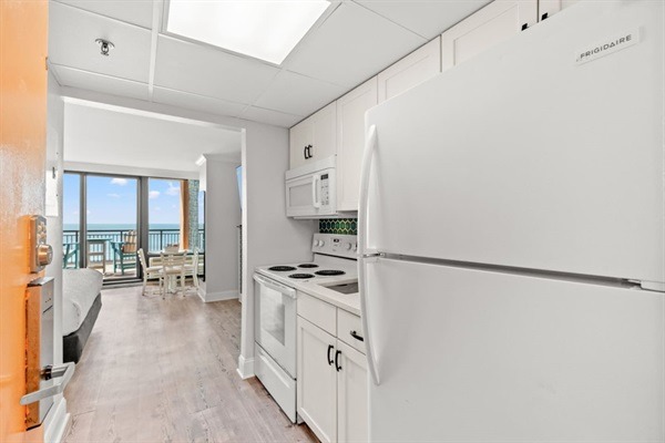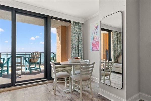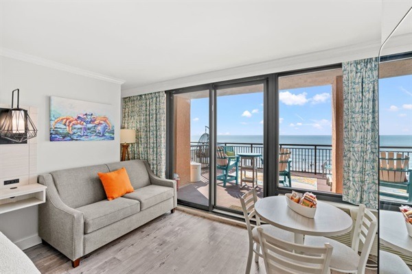 Looking for the perfect beach getaway? Look no further than our oceanfront King suite with a private outdoor patio and breathtaking ocean views. Located right on the sandy shores of the beach, our condo offers everything you need for a relaxing and luxurious vacation. Step inside to find a spacious and beautifully decorated living area, equipped with all the comforts of home including a well equipped kitchen, comfortable seating, and a cozy King size bed. Our sofa converts to a full size sleeper. Spend your mornings sipping coffee on the private patio while taking in the stunning ocean views and the sound of the waves crashing on the shore. When you're ready to hit the beach, you'll have direct access to the sandy shoreline, just steps away!. Lounge on the beach, take a dip in the ocean, or try your hand at some water sports – the possibilities are endless. At the end of the day, unwind in the comfort of your own private space and fall asleep to the soothing sound of the ocean. Our condo is also conveniently located near popular restaurants, shops, and attractions, making it the perfect base for exploring all that the area has to offer. Don't miss out on the chance to experience a memorable beach vacation with this updated oceanfront condo that offers amazing inside and outside spaces! Book your stay today and create unforgettable memories that will last a lifetime.